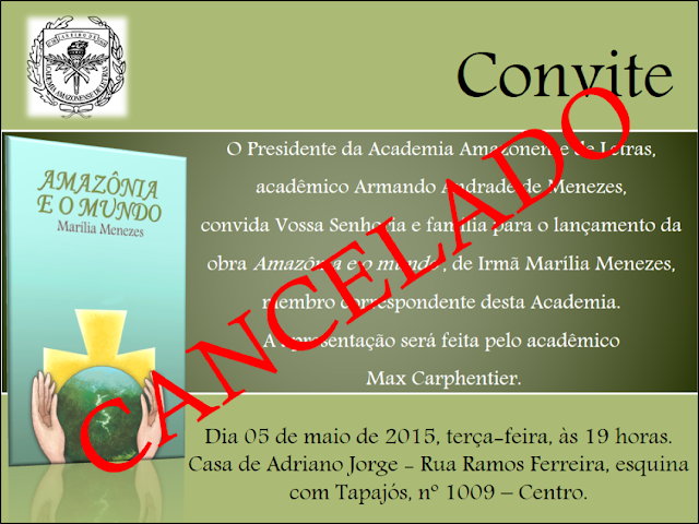 O lançamento do livro da Irmã Marília Menezes, que deveria acontecer na próxima terça-feira, 5 de maio, foi cancelado, em virtude do falecimento de uma irmã da autora, em Belém, na tarde de ontem, 2 de maio. Nossos pêsames à família.